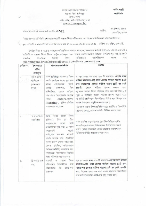 সরকারের নির্বাচনি ইশতেহার অনুযায়ী ১৮০ দিনের কর্মপরিকল্পনা প্রকাশ করেছে বাংলাদেশ মাদরাসা শিক্ষা অধিদপ্তর। এই কর্মপরিকল্পনা বাস্তবায়ন করে নির্ধারিত ইমেইলে প্রতিবেদন পাঠাতে হবে।