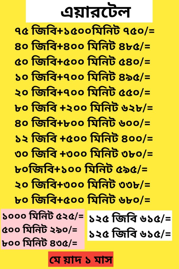 50 জিবি +500 মিনিট 540/= রে 599 চেক