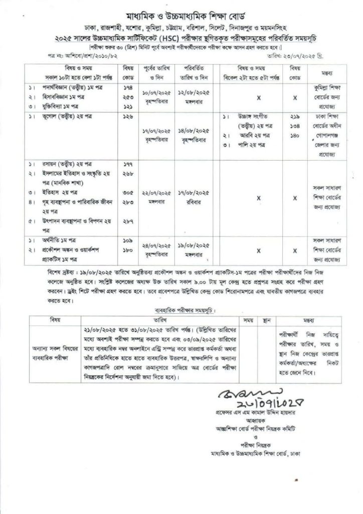 ২০২৫ সালের উচ্চমাধ্যমিক সার্টিফিকেট (HSC)পরীক্ষার স্থগিতকৃত পরীক্ষাসমূহের পরিবর্তিত সময়সূচি।
