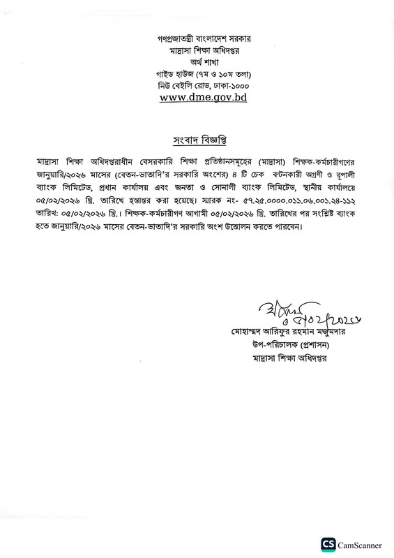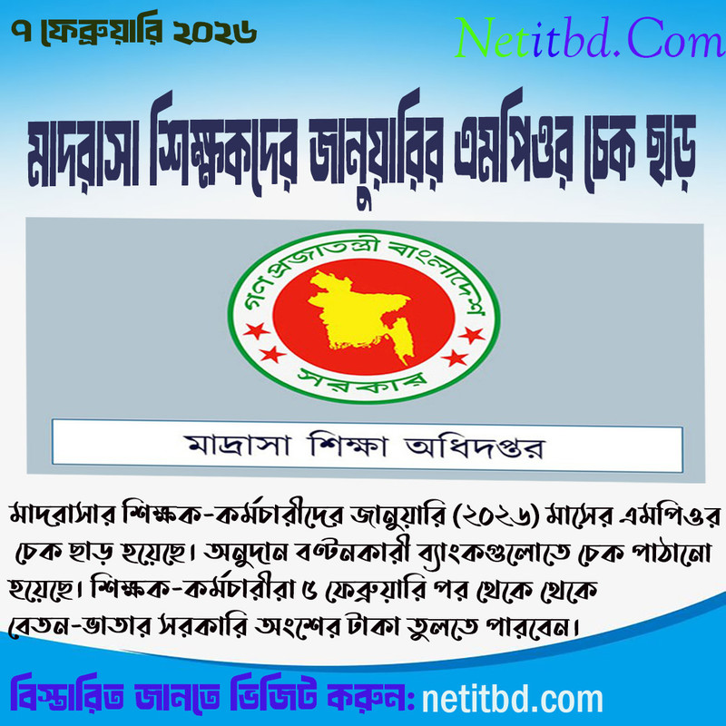 MPO January 2026 PDF downloadমাদরাসা শিক্ষা অধিদপ্তরাধীন বেসরকারি শিক্ষাপ্রতিষ্ঠানগুলোর (মাদরাসা) শিক্ষক-কর্মচারীদের জানুয়ারি মাসের (বেতন-ভাতার সরকারি অংশের) ৪টি চেক বন্টনকারী অগ্রণী ও রূপালী ব্যাংক লিমিটেড, প্রধান কার্যালয় এবং জনতা ও সোনালী ব্যাংক লিমিটেড, স্থানীয় কার্যালয়ে ৫ ফেব্রুয়ারি হস্তান্তর করা হয়েছে।